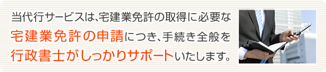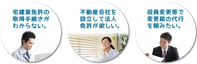 不動産業を始めるために必要となる、宅建業免許。当事務所では、この宅建業免許を新規に取得するための申請から、免許取得後の各種手続きまで、宅建業免許に関する様々な行政手続きの代行・サポートを承っております。