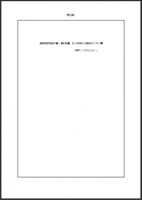 第五面は証紙を貼り付ける用紙ですが、東京都の場合、申請書が窓口で受理される際、その場で現金納付となるため、第五面はなにも貼らずに持参します。